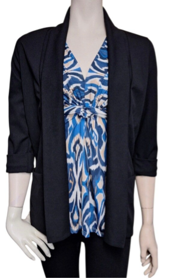 Stijlvolle blazer met 3/4 mouwen en praktische zakken. De blazer heeft een losse pasvorm en is open te dragen, ideaal voor zowel casual als geklede outfits. Dankzij de lichte stretch biedt deze blazer een comfortabel draaggevoel en een mooie fit.